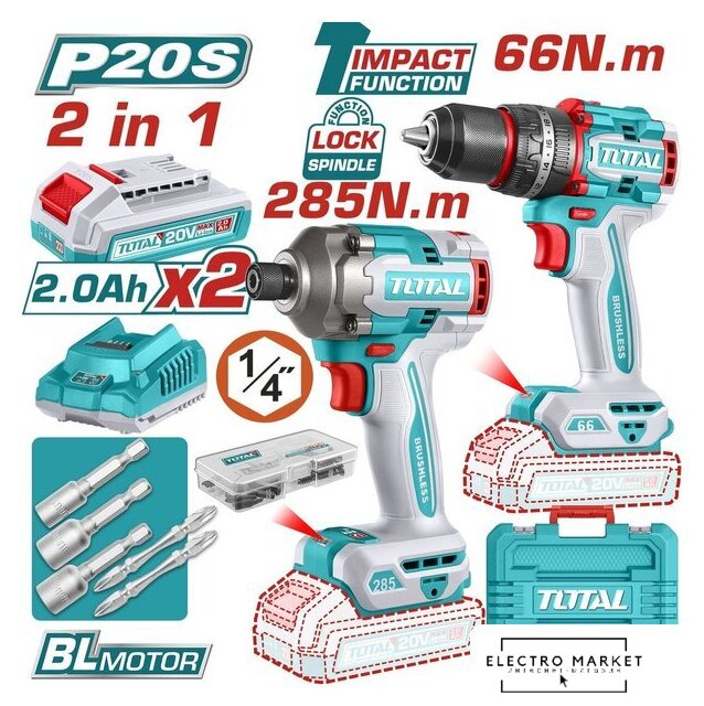 | Комплектация | Дрель-шуруповерт ударная TOTAL TIDLI206681 - 1 шт.Винтоверт TOTAL - 1 шт.Аккумулятор 2,0 Ач TFBLI20011 - 2 шт.Зарядное устройство TFCLI2001 - 1 шт.Аксессуары для дрели шуруповерта - 47 шт.Биты двухсторонние - 2 шт.Торцевые насадки - 3 шт.ИнструкцияКейс |
