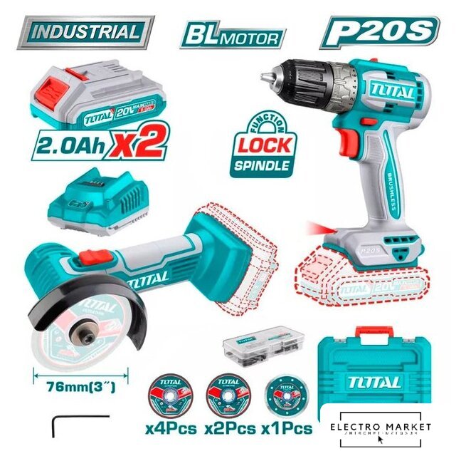 Комплектация | Дрель-шуруповерт TOTAL TDLI20453 - 1 шт. Мини-пила TOTAL TCKLI20278 - 1 шт. Аккумулятор 2,0 А*ч - 2 шт. Быстрое зарядное устройство - 1 шт. Диск отрезной для пилы 76 мм - 4 шт. Диск шлифовальный для пилы 76 мм - 2 шт. Диск алмазный для пилы 76 мм - 1 шт. Набор набор аксессуаров 47 шт. Инструкция Кейс |