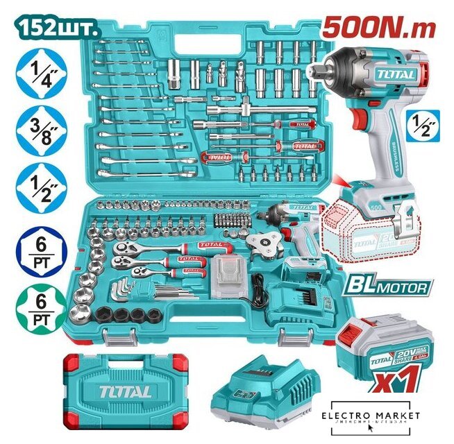| Комплектация | Гайковерт TOTAL TIWLI2050 - 1 шт.Аккумулятор 4,0 А·ч TFBLI2002 - 1 шт.Зарядное устройство TFCLI2001E - 1 шт.Трещотка 1/4" - 1 шт.Торцевые головки 1/4" (4 / 4,5 / 5 / 5,5 / 6 / 7 / 8 / 9 / 10 / 11 / 12 / 13 / 14) - 13 шт.Головки 1/4"x32(L) с битами: Н3 / H4 / H5 / H6 / H8 / T8 / T10 / T15 / T20 / T25 / T30 / T40 / SL5,5 / SL6,5 / PH2 / PH3 / PZ2 / PZ3 - 18 шт.Глубокие головки 1/4" DR 50 мм(L): 8, 9, 10, 12 мм - 4 шт.Удлинитель 1/4" DR x 50 мм - 1 шт.Вороток: 1/4" x 150 мм - 1 шт.Карданный шарнир 1/4" - 1 шт.Трёхходовой адаптер 1/4"(F) x 1/4"(M) - 1 шт.Держатель бит: 1/4"x6,35 мм - 1 шт.Биты 6,35x25мм (L): T5 / T6 / T7 / T8 / T9 / T10 / T15 / T20 / T25 / T30 / PH1 / PH2 / PH2 / PH3 / PH4 / PZ1 / PZ2 / PZ2 / PZ3 / PZ4 / SL3 / SL3 / SL4 / SL4 / SL5 / SL5.5 / SL6 / SL6.5 / SL7 / SL7 / H2 / H3 / H3 / H4 / H4 / H5 / H5 / H6 / H7 / H7 - 40 шт.Ударные головки 17, 19, 21, 22 мм - 4 шт.Трещотка 1/2" - 1 шт.Карданный шарнир 1/2" - 1 шт.Головки 1/2" (21, 22, 23, 24, 27, 30, 32 мм) - 7 шт.Свечные головки 1/2" (16, 21 мм) - 2 шт.Удлинители: 1/2" (125 мм, 250 мм) - 2 шт.Трёхсторонний адаптер 1/2": 3/8"(M) x 1/2"(F) - 1 шт.Шестигранные головки 3/8" (10, 11, 12, 13, 14, 15, 16, 17, 18, 19 мм) - 10 шт.Глубокие шестигранные головки 3/8" (13, 14, 15, 17 мм) - 4 шт.Звездообразные головки 3/8" (E10, E11, E12, E14, E16, E18, E20) - 7 шт.Вороток 3/8" - 1 шт.Удлинители 3/8" (75 мм, 150 мм) - 2 шт.Карданный шарнир 3/8" - 1 шт.Трёхсторонний адаптер 3/8": 3/8"(F)x3/8"(M) - 1 шт.Ключ для масляного фильтра - 1 шт.Отвёртки: SL6.5x150, PH2x150 - 2 шт.комбинированные ключи 6, 8, 9, 10, 11, 12, 13, 14, 15, 17, 18, 19 - 12 шт.Ключи Torx T10, T15, T20, T25, T27, T30, T40, T45, T50 - 9 шт.Кейс |