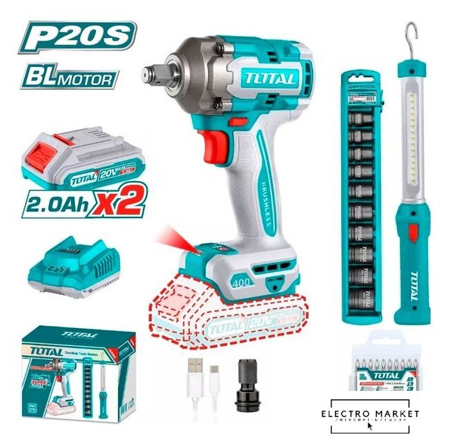 Комплектация | - Гайковерт TIWLI2050 - 1 шт.- Фонарь TOTAL TWLI35261 - 1 шт.- Аккумулятор TFBLI20011 2,0 Ач - 2 шт.- Зарядное устройство TFCLI2001 - 1 шт.- Переходник 1/2" квадрат - Hex 1/4" - 1 шт.- Ударные торцевые головки - 10 шт.- Биты - 10 шт.- Кабель USB для зарядки фонаря - 1 шт.- Коробка. |