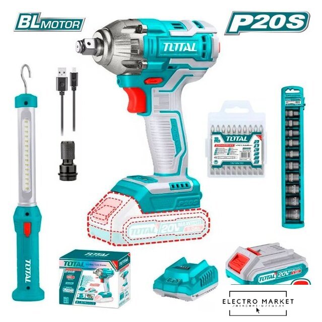 Комплектация | - Гайковерт TIWLI2038 - 1 шт.- Фонарь TOTAL TWLI35261 - 1 шт.- Аккумулятор TFBLI20011 - 2 шт.- Зарядное устройство TFCLI2001 - 1 шт.- Двухсторонние биты PH2+SL6.0 65 мм - 10 шт.- Переходник 1/2" квадрат / 1/4" Hex - 1 шт.- Ударные торцевые головки - 10 шт.- Кабель USB для зарядки TWLI35261 - 1 шт.- Коробка |