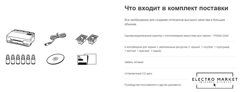 | Комплектация | PIXMA G5406 контейнеров для чернил с увеличенным ресурсом (1 черный, 1 голубой, 1 пурпурный, 1 желтый, 1 красный, 1 серый)Кабель питанияУстановочный CD-дискРуководства пользователя и другие документы |