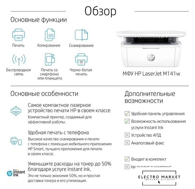 Комплектация | МФУ HP LaserJet M141a; кабель питания; картридж HP LaserJet с черным тонером (ресурс: 500 страниц); плакат с инструкциями по настройке; справочное руководство; руководство по гарантии; рекламная листовка |