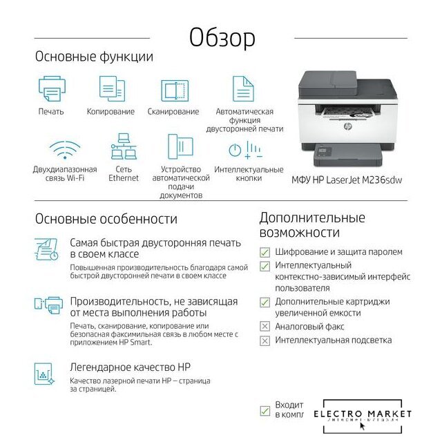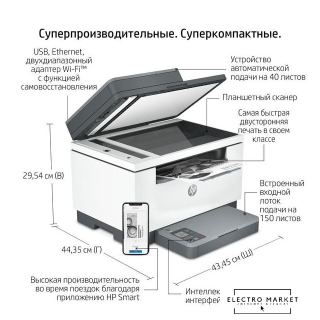 МФУ, лазерный, черно-белый, формат A4 (210x297 мм), скорость ч/б печати 30 стр/мин, разрешение 1200 dpi, LAN, Wi-Fi