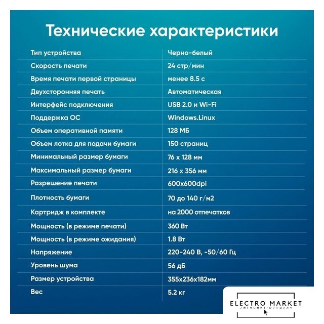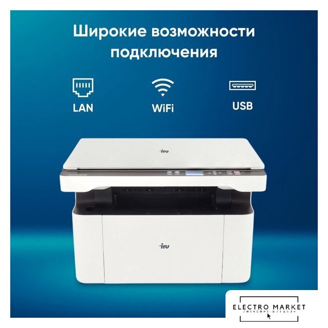 МФУ, лазерный, черно-белый, формат A4 (210x297 мм), скорость ч/б печати 20 стр/мин, разрешение 600 dpi, факс, LAN, Wi-Fi