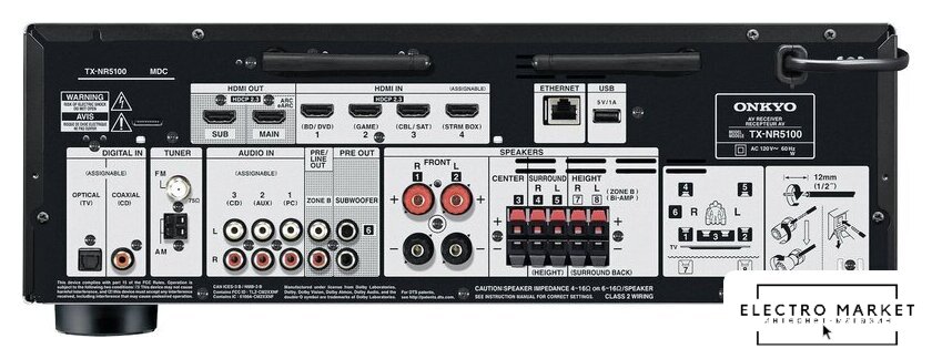 AV ресивер, 5 каналов, 70 Вт/8 Ом, 90 Вт/6 Ом, выходы 5.2, КНИ 0.08%, SNR 98 дБ, USB, BT