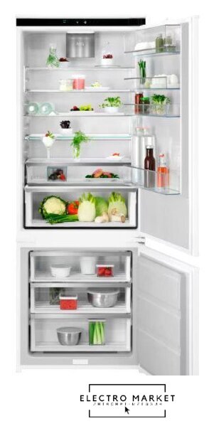 встраиваемый, полный No Frost, электронное управление, полезный объём: 253 л (183 + 70 л), перенавешиваемые двери, складная полка, лоток для яиц, 55.9x54.6x177 см, белый