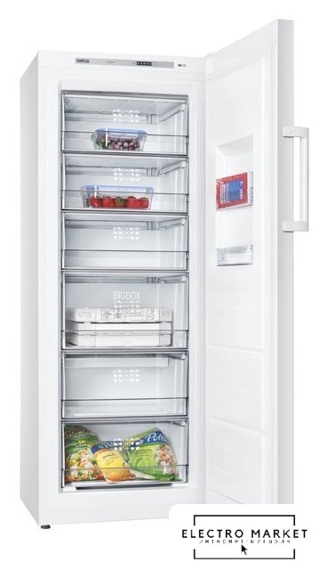 отдельностоящий, без No Frost, электронное управление, класс A+, полезный объём: 370 л (251 + 119 л), зона свежести, перенавешиваемые двери, полка для вина, лоток для яиц, 59.5x62.9x206.8 см, белый