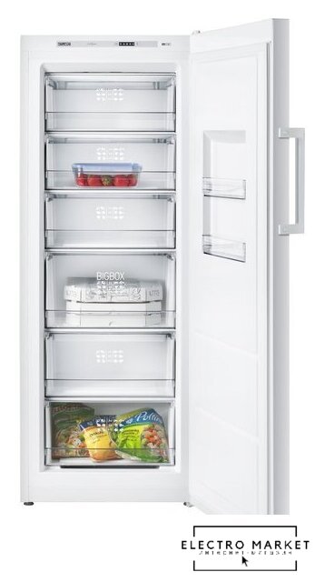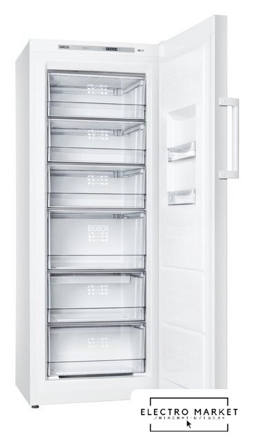 отдельностоящий, без No Frost, электронное управление, класс A+, полезный объём: 324 л (205 + 119 л), зона свежести, перенавешиваемые двери, полка для вина, лоток для яиц, 59.5x62.9x186.8 см, белый