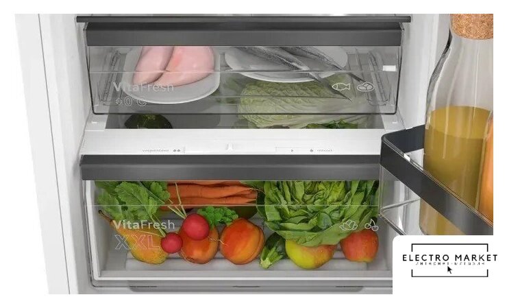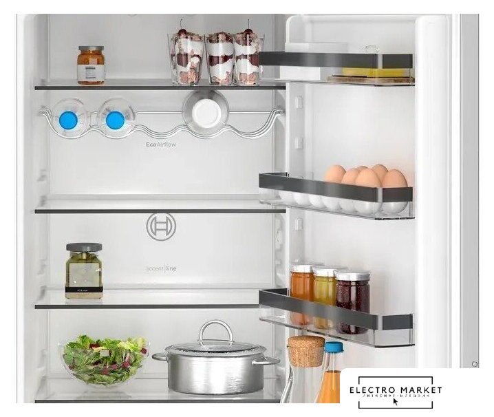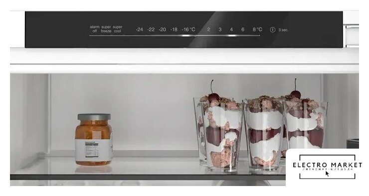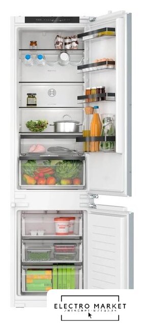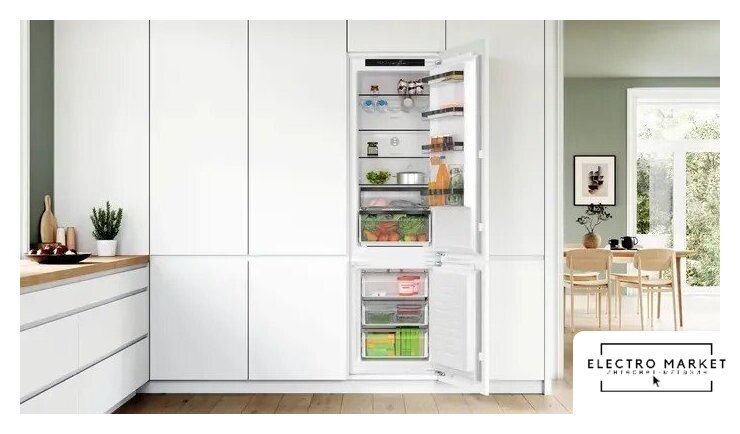встраиваемый, No Frost (морозильная камера), электронное управление, полезный объём: 260 л (184 + 76 л), зона свежести, перенавешиваемые двери, лоток для яиц, 54.1x54.8x177.2 см, белый