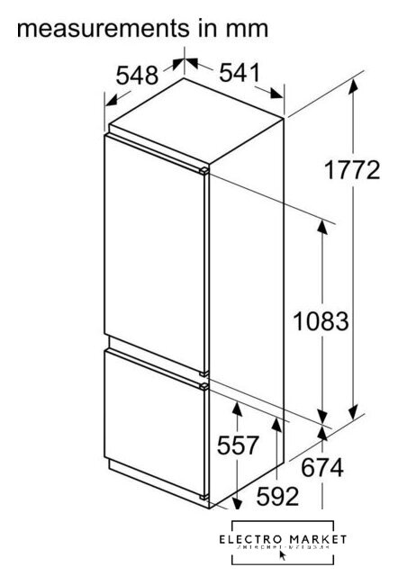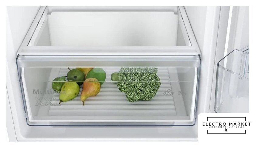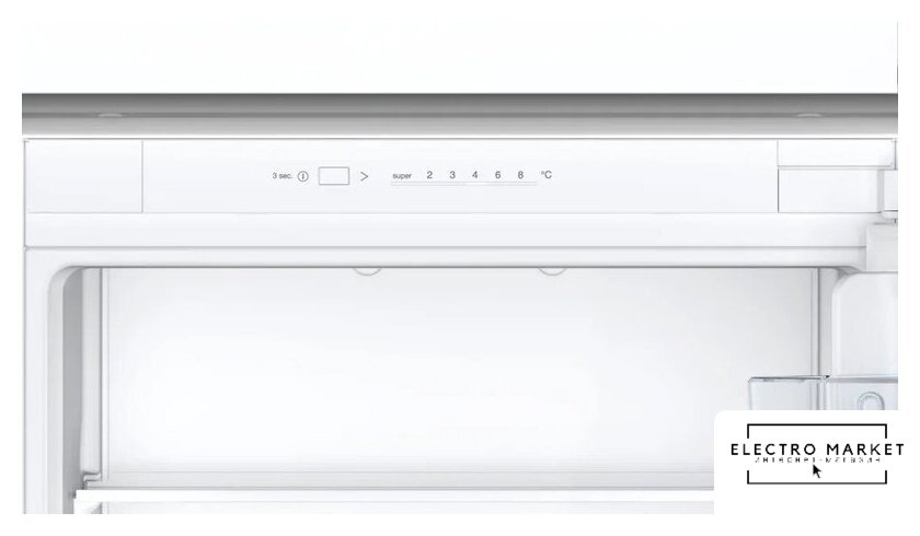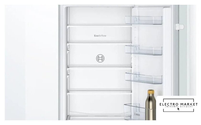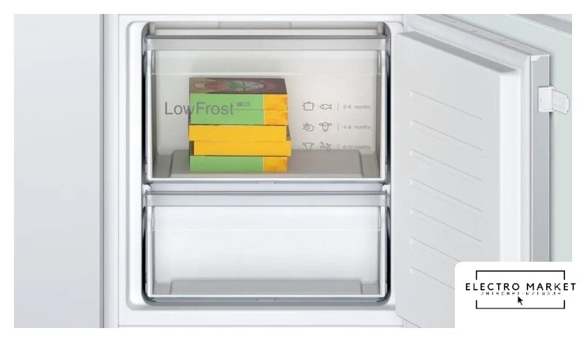 встраиваемый, скользящие направляющие, без No Frost, электронное управление, полезный объём: 269 л (196 + 73 л), перенавешиваемые двери, лоток для яиц, 54x54.9x177.2 см, белый