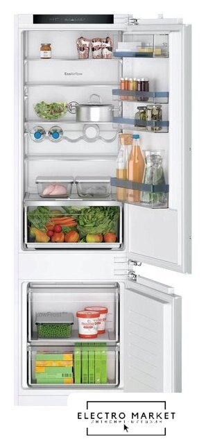 встраиваемый, скользящие направляющие, полный No Frost, электронное управление, полезный объём: 267 л (193 + 74 л), инверторный компрессор, зона свежести, перенавешиваемые двери, полка для вина, лоток для яиц, 54x55x177.5 см, белый