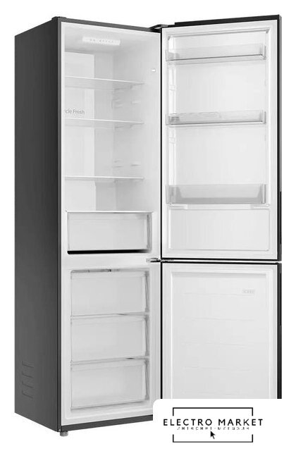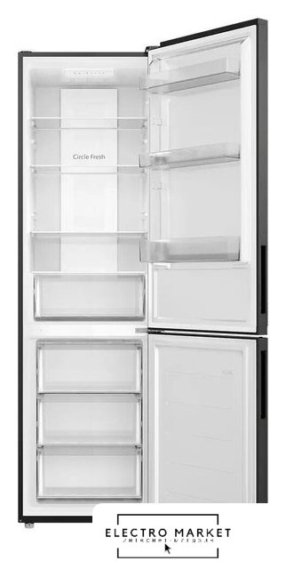 отдельностоящий, полный No Frost, электронное управление, класс A+, полезный объём: 384 л (277 + 107 л), инверторный компрессор, перенавешиваемые двери, лоток для яиц, 59.5x68.2x203 см, графит