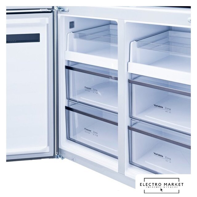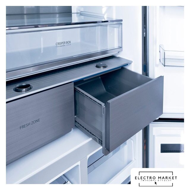 отдельностоящий, полный No Frost, электронное управление, класс A+, полезный объём: 558 л (368 + 190 л), инверторный компрессор, зона свежести, лоток для яиц, 91x75x179 см, серый