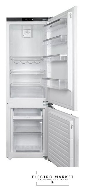 встраиваемый, полный No Frost, электронное управление, класс A+, полезный объём: 210 л (140 + 70 л), инверторный компрессор, перенавешиваемые двери, лоток для яиц, 54x54x177.2 см, белый