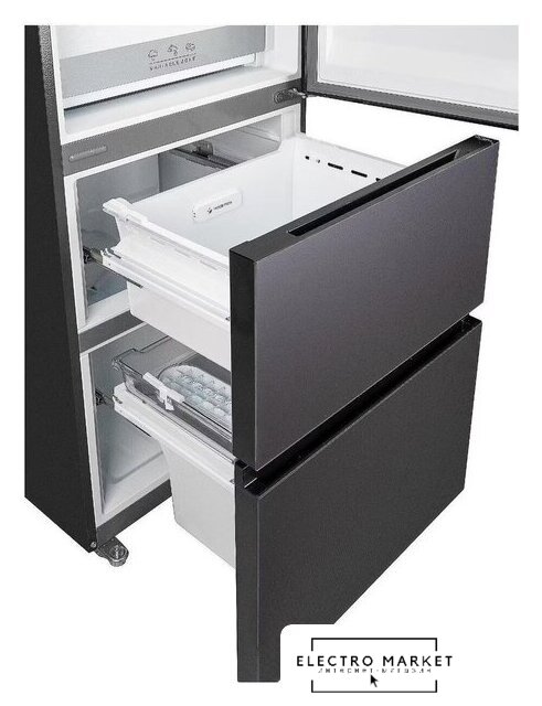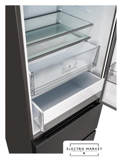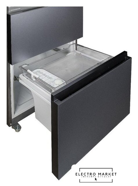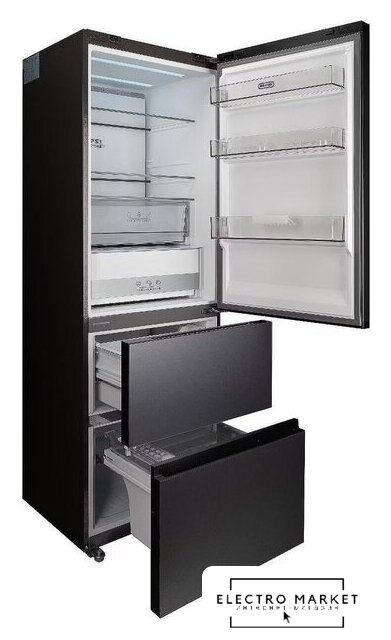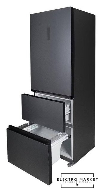 отдельностоящий, полный No Frost, электронное управление, класс A++, полезный объём: 362 л (237 + 125 л), инверторный компрессор, лоток для яиц, отделка: стекло, 79.5x61.2x180 см, черный