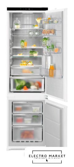 встраиваемый, скользящие направляющие, полный No Frost, электронное управление, полезный объём: 394 л (295 + 99 л), зона свежести, перенавешиваемые двери, подставка-лоток для бутылок, лоток для яиц, 69x55.1x193.5 см, белый