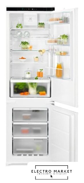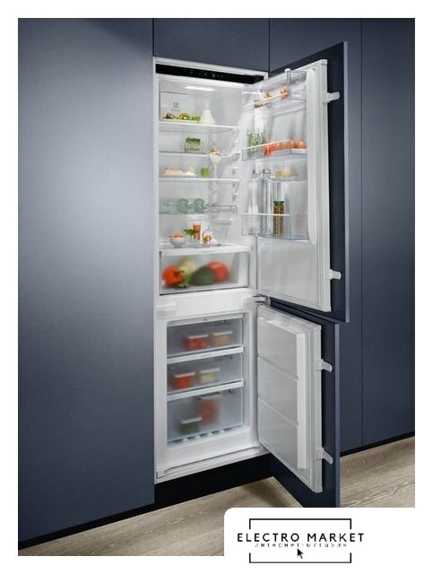 встраиваемый, жесткое, No Frost (морозильная камера), сенсорное управление, класс A+, полезный объём: 251 л (181 + 70 л), перенавешиваемые двери, лоток для яиц, 55.9x54.6x177 см, белый