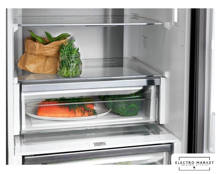 отдельностоящий, No Frost (морозильная камера), сенсорное управление, класс A++, полезный объём: 474 л (346 + 128 л), инверторный компрессор, перенавешиваемые двери, автодоводчик дверей, складная полка, полка для вина, лоток для яиц, 74.7x67.5x201.5 см, серебристый