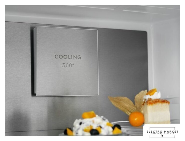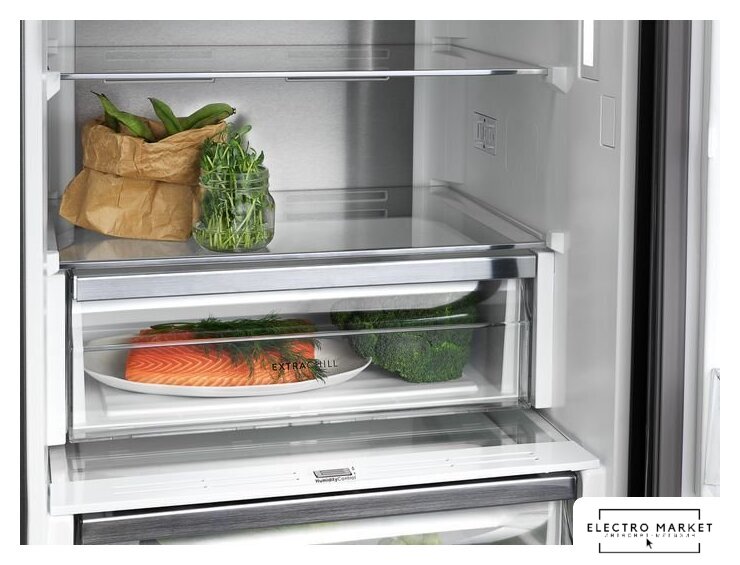 отдельностоящий, полный No Frost, электронное управление, класс A++, полезный объём: 466 л (275 + 175 л), инверторный компрессор, зона свежести, подставка-лоток для бутылок, лоток для яиц, отделка: стекло, 79x73x180 см, темная сталь