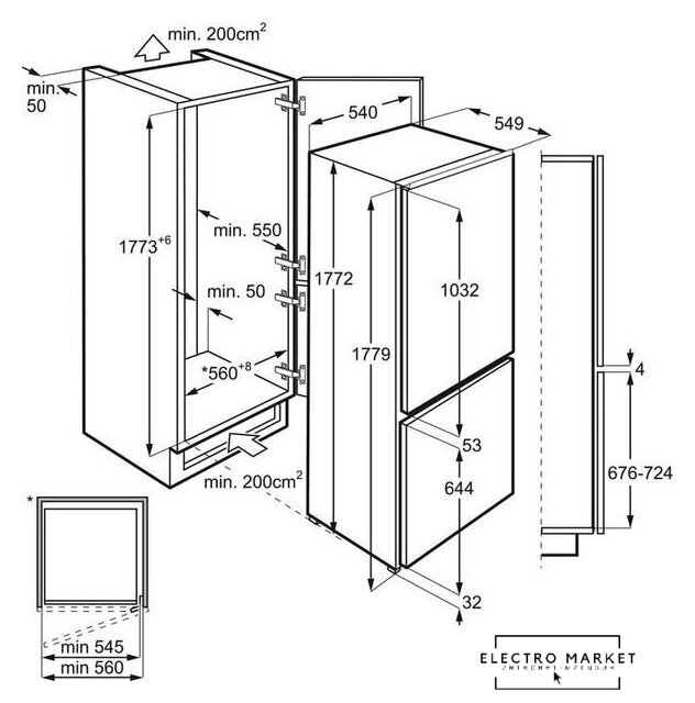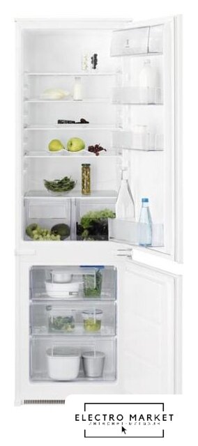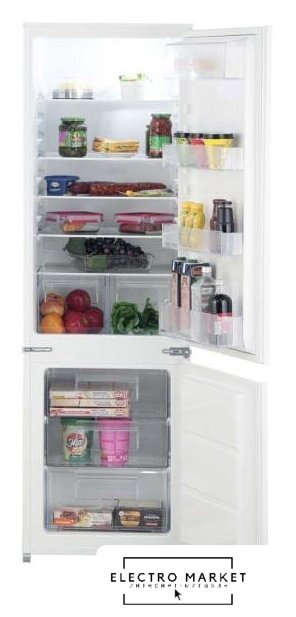 встраиваемый, скользящие направляющие, No Frost (морозильная камера), электронное управление, класс A+, полезный объём: 253 л (183 + 70 л), перенавешиваемые двери, лоток для яиц, 55.9x54.6x177 см, белый