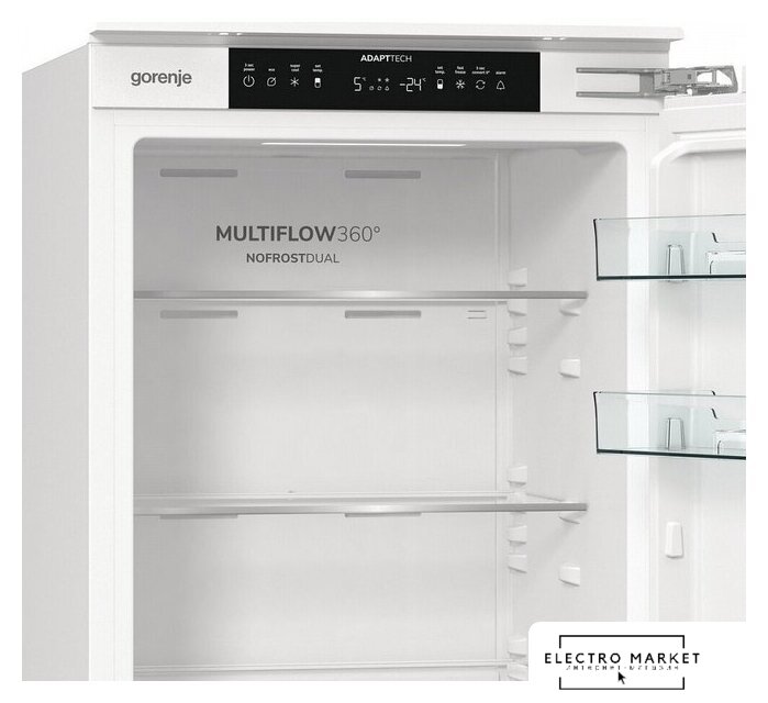 встраиваемый, жесткое, полный No Frost, электронное управление, класс A+, полезный объём: 244 л (176 + 68 л), инверторный компрессор, зона свежести, перенавешиваемые двери, автодоводчик дверей, полка для вина, лоток для яиц, 54x54.5x177.2 см, белый