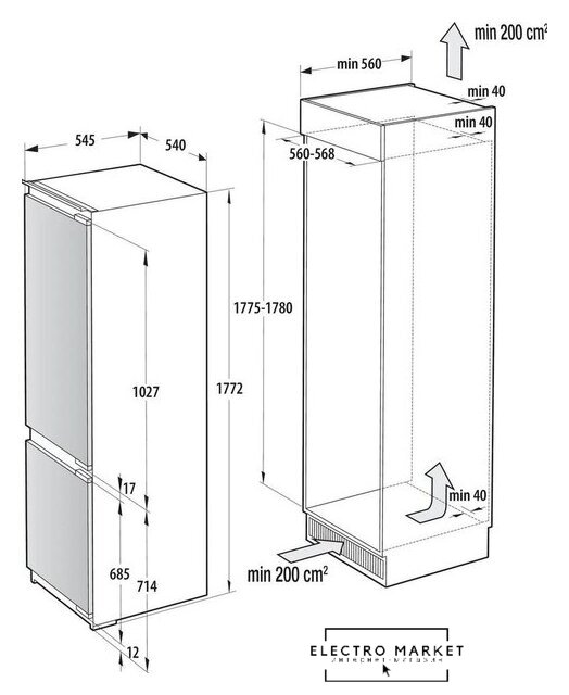 встраиваемый, скользящие направляющие, без No Frost, сенсорное управление, класс A+, полезный объём: 264 л (183 + 81 л), перенавешиваемые двери, лоток для яиц, 54.1x54.5x177 см, белый