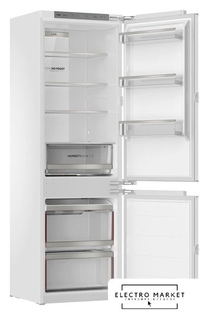 встраиваемый, полный No Frost, электронное управление, класс A++, полезный объём: 254 л (185 + 69 л), инверторный компрессор, зона свежести, перенавешиваемые двери, полка для вина, лоток для яиц, 54x54.5x177.5 см, белый