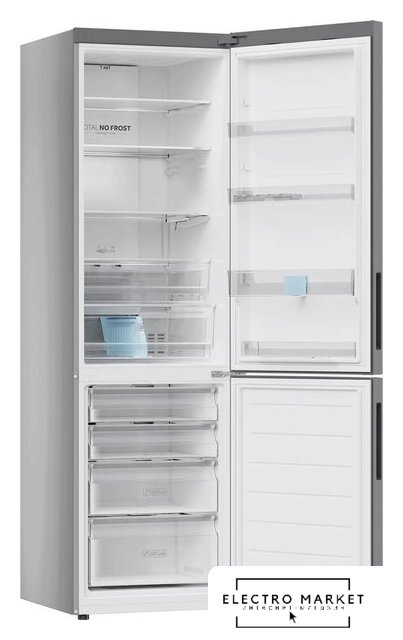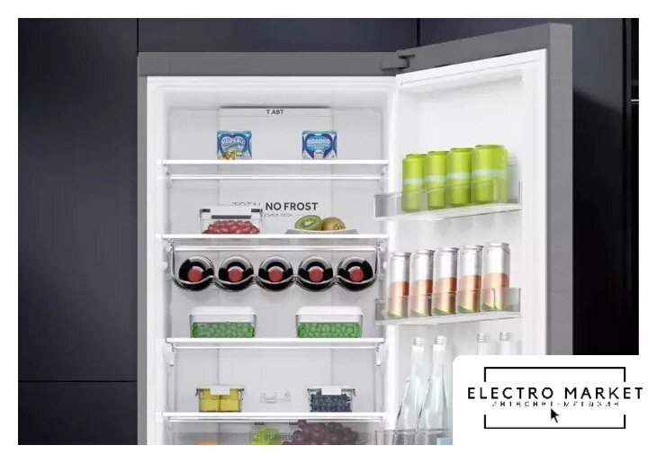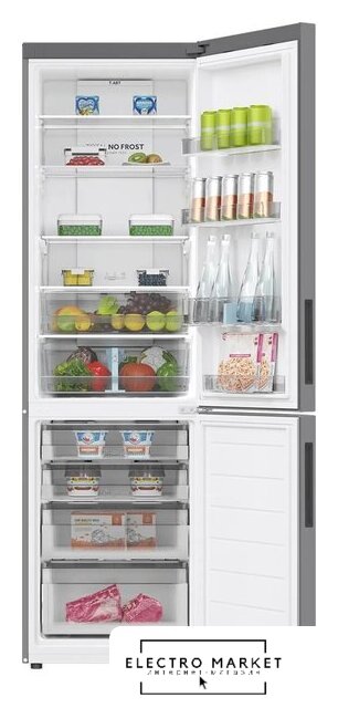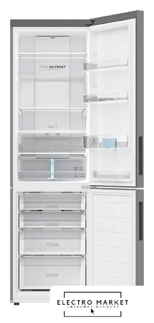 отдельностоящий, полный No Frost, электронное управление, класс A+, полезный объём: 384 л (277 + 107 л), инверторный компрессор, перенавешиваемые двери, лоток для яиц, 59.5x68.2x203 см, серебристый