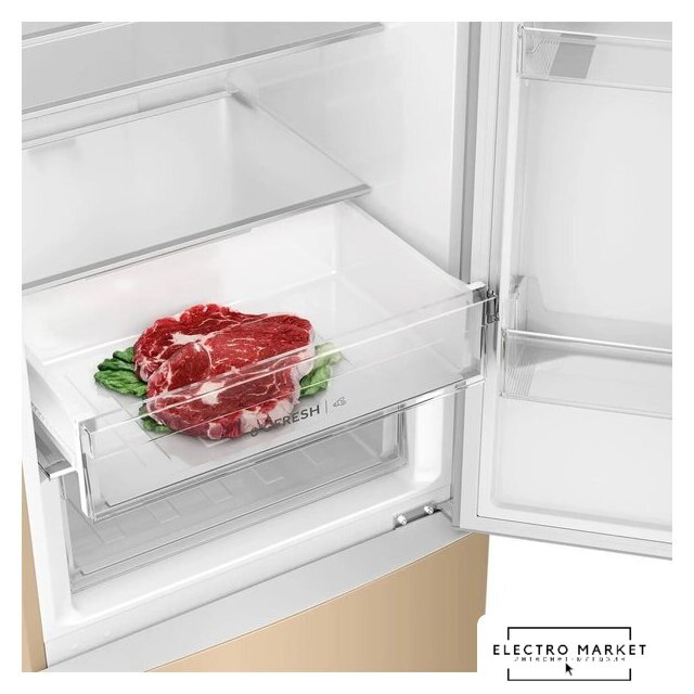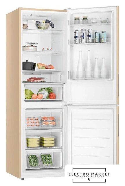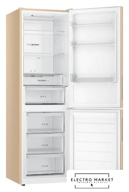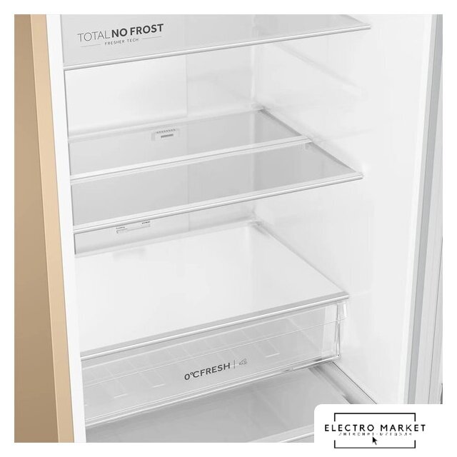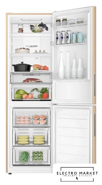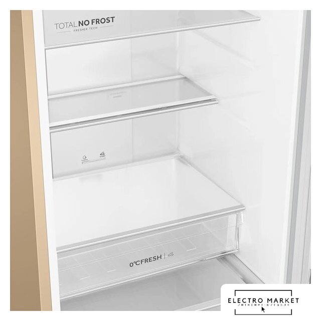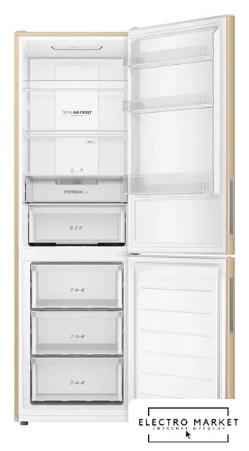 отдельностоящий, полный No Frost, электронное управление, класс A, полезный объём: 368 л (263 + 105 л), зона свежести, перенавешиваемые двери, складная полка, лоток для яиц, 59.5x65x200 см, бежевый
