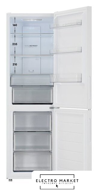 отдельностоящий, No Frost (морозильная камера), механическое управление, класс A+, полезный объём: 279 л (204 + 75 л), перенавешиваемые двери, лоток для яиц, отделка: стекло, 57.4x62.5x188.4 см, белый