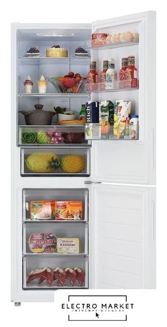 отдельностоящий, без No Frost, электронное управление, класс A+, полезный объём: 364 л (205 + 159 л), зона свежести, перенавешиваемые двери, выдвижной/подвесной контейнер, подставка-лоток для бутылок, лоток для яиц, 59.5x62.7x206.8 см, белый