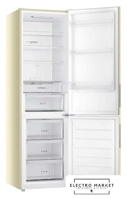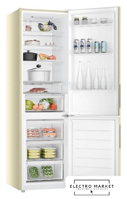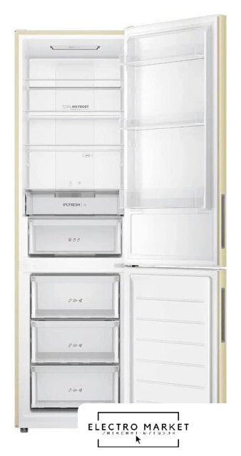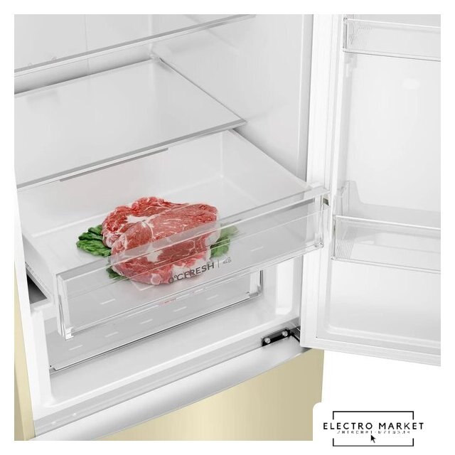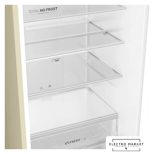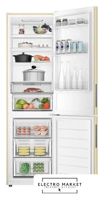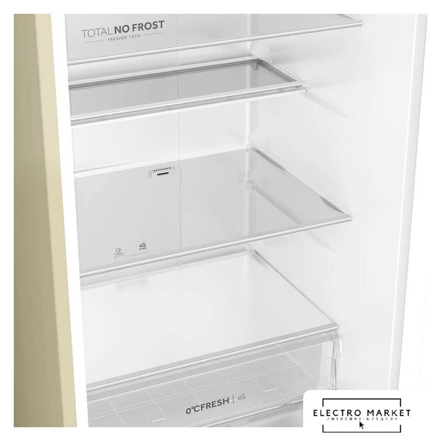 отдельностоящий, полный No Frost, электронное управление, класс A+, полезный объём: 384 л (277 + 107 л), инверторный компрессор, перенавешиваемые двери, складная полка, лоток для яиц, 59.5x68.2x203 см, бежевый