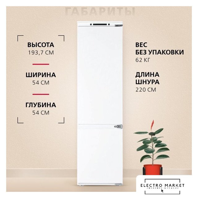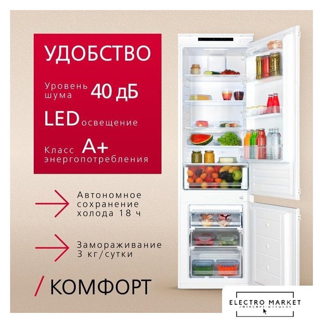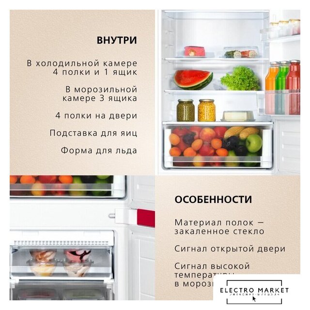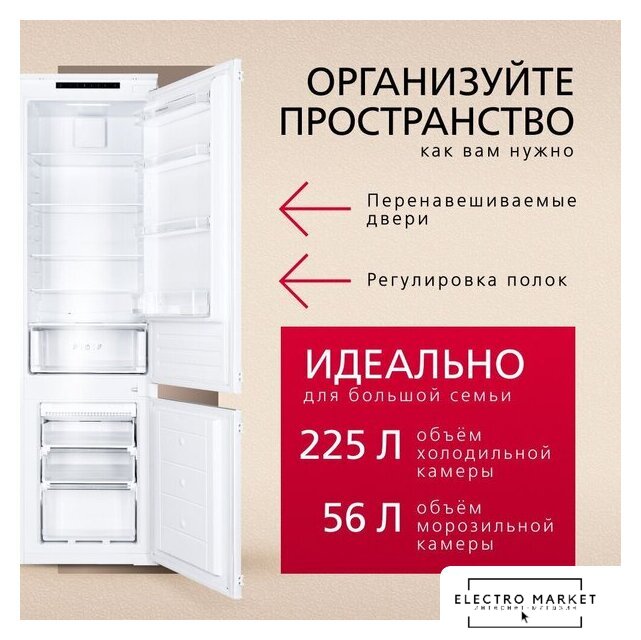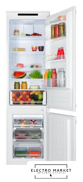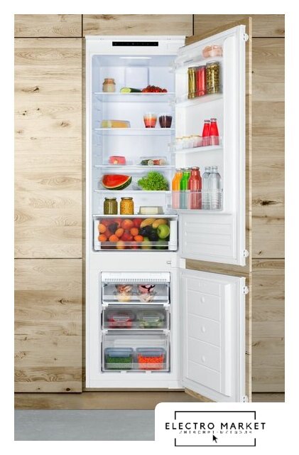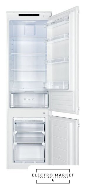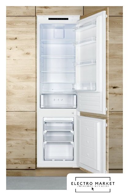 встраиваемый, жесткое, без No Frost, сенсорное управление, полезный объём: 264 л (183 + 81 л), перенавешиваемые двери, лоток для яиц, 55.9x54.6x177 см, белый