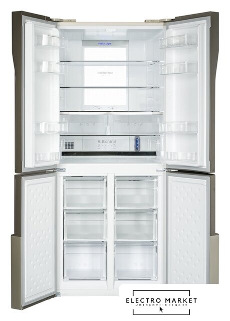 отдельностоящий, полный No Frost, электронное управление, класс A++, полезный объём: 612 л (407 + 205 л), инверторный компрессор, лоток для яиц, отделка: стекло, 91.1x74.6x178 см, белый