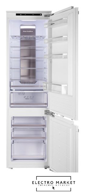 встраиваемый, скользящие направляющие, полный No Frost, электронное управление, класс A+, полезный объём: 237 л (170 + 67 л), инверторный компрессор, зона свежести, перенавешиваемые двери, лоток для яиц, 54x55x176.9 см, белый