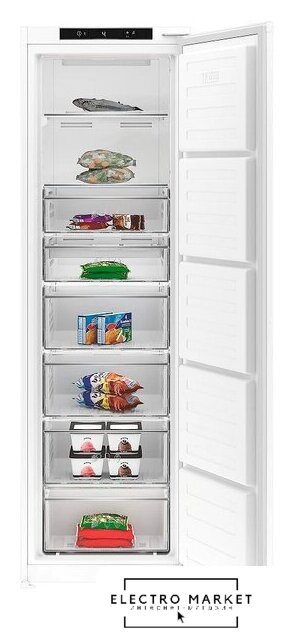 встраиваемый, скользящие направляющие, без No Frost, электронное управление, класс A+, полезный объём: 258 л (187 + 71 л), зона свежести, перенавешиваемые двери, полка для вина, лоток для яиц, 54x54.5x177.2 см, белый