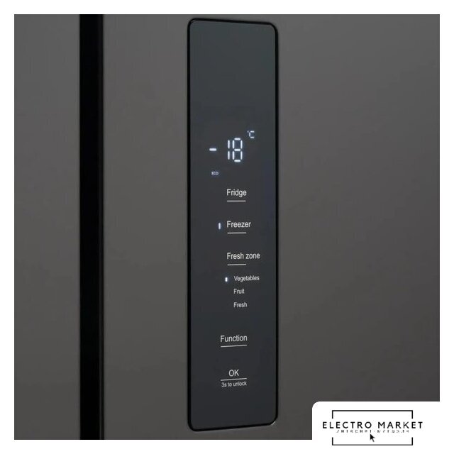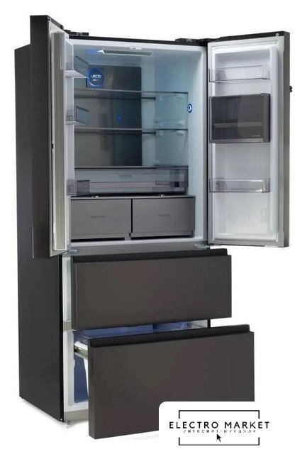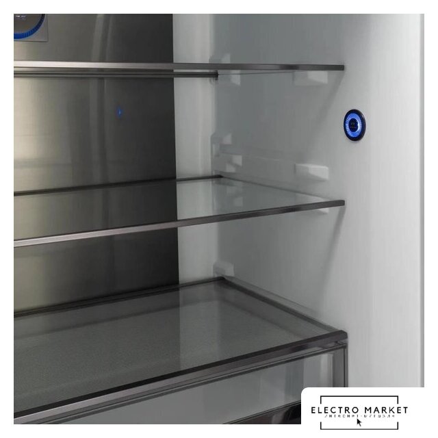 отдельностоящий, полный No Frost, сенсорное управление, класс A+, полезный объём: 440 л (286 + 154 л), инверторный компрессор, перенавешиваемые двери, лоток для яиц, 75.3x60x191 см, графит