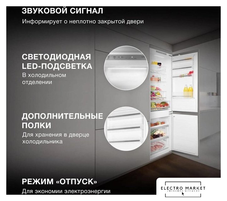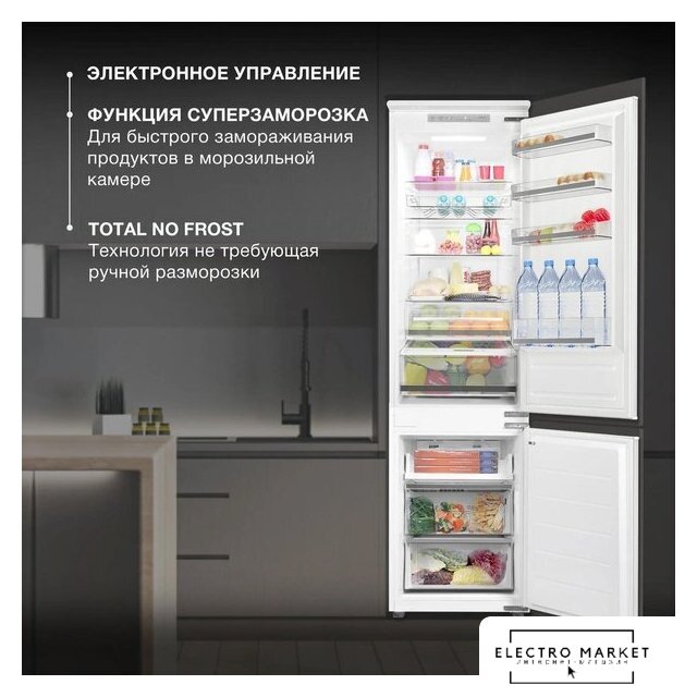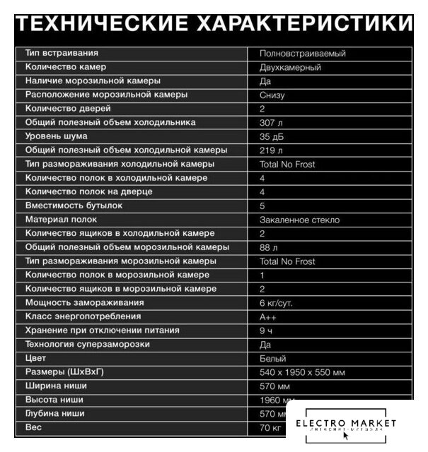 встраиваемый, жесткое, No Frost (морозильная камера), электронное управление, класс A+, перенавешиваемые двери, 54x54.5x177 см, белый
