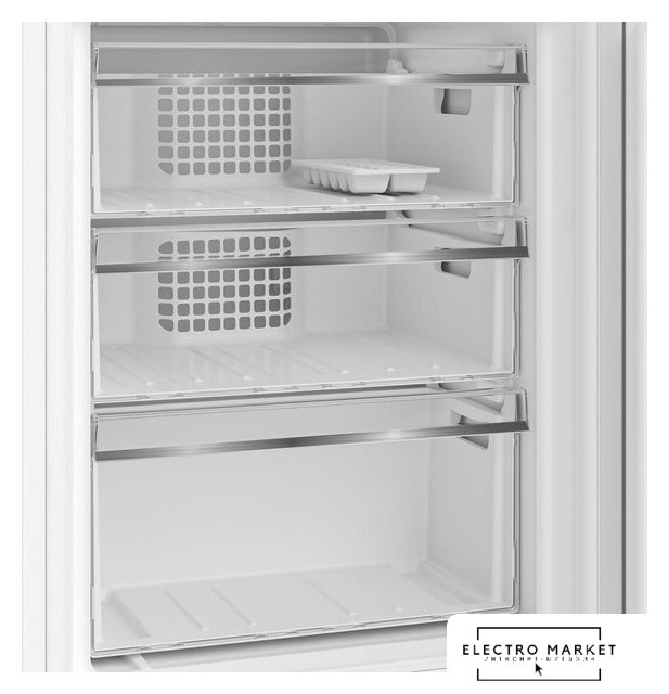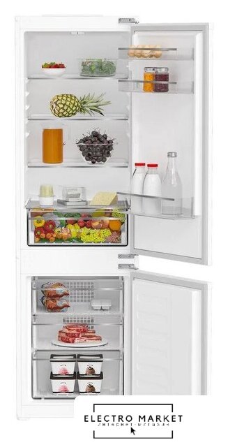 встраиваемый, без No Frost, электронное управление, класс A+, полезный объём: 250 л (185 + 65 л), перенавешиваемые двери, лоток для яиц, 54x54x178 см, белый