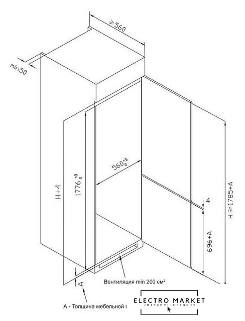 встраиваемый, No Frost (морозильная камера), механическое управление, класс A+, полезный объём: 289 л (220 + 69 л), перенавешиваемые двери, лоток для яиц, 54x54.5x193.5 см, белый