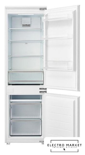 встраиваемый, скользящие направляющие, без No Frost, электронное управление, полезный объём: 257 л (195 + 62 л), перенавешиваемые двери, лоток для яиц, 54x54.9x177.2 см, белый