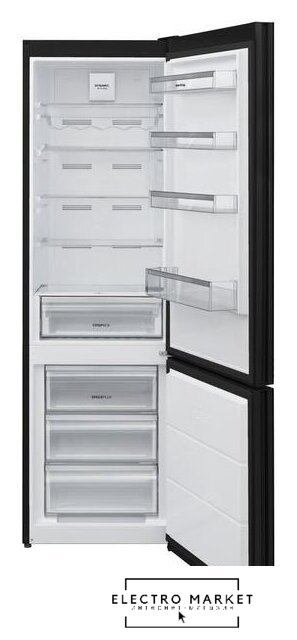 отдельностоящий, полный No Frost, электронное управление, класс A++, полезный объём: 360 л (266 + 94 л), зона свежести, нулевой зазор, складная полка, лоток для яиц, отделка: стекло, 59.5x65x201 см, черный