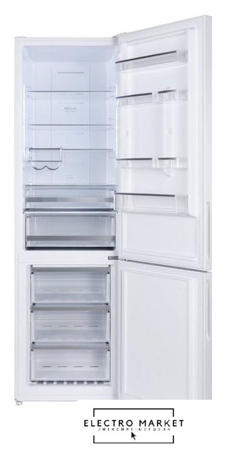 отдельностоящий, полный No Frost, электронное управление, класс A+, полезный объём: 360 л (256 + 104 л), зона свежести, перенавешиваемые двери, автодоводчик дверей, складная полка, лоток для яиц, 59.5x66x201.8 см, белый