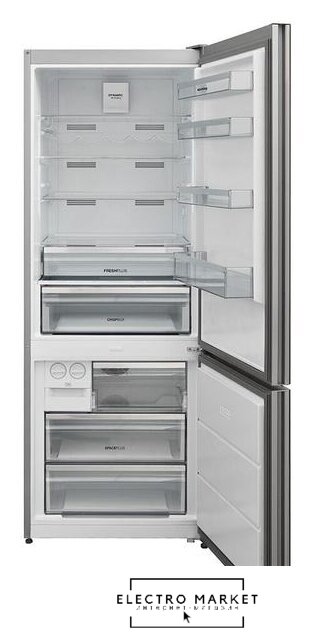 отдельностоящий, полный No Frost, электронное управление, класс A++, полезный объём: 413 л (250 + 163 л), инверторный компрессор, зона свежести, лоток для яиц, отделка: стекло, 77x60x193.5 см, серый