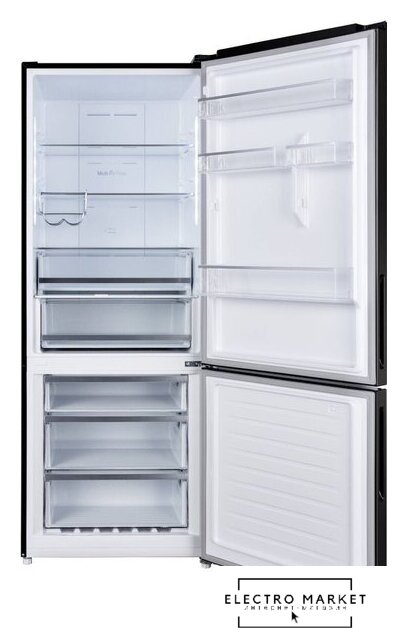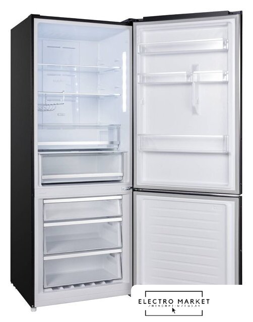 отдельностоящий, полный No Frost, электронное управление, класс A, полезный объём: 456 л (303 + 153 л), лоток для яиц, отделка: стекло, 83.3x65.5x177.5 см, черный