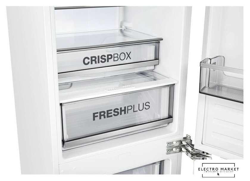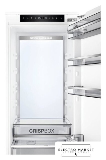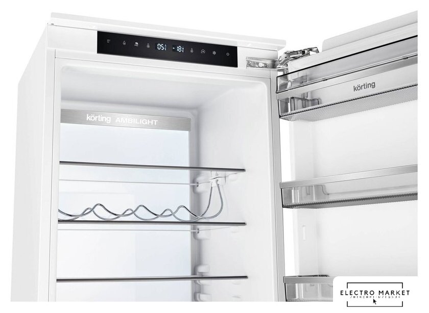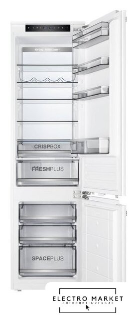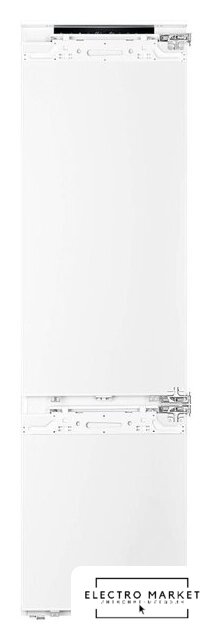 встраиваемый, полный No Frost, электронное управление, класс A, полезный объём: 284 л (215 + 69 л), инверторный компрессор, зона свежести, перенавешиваемые двери, полка для вина, лоток для яиц, 54x54.5x193.5 см, белый