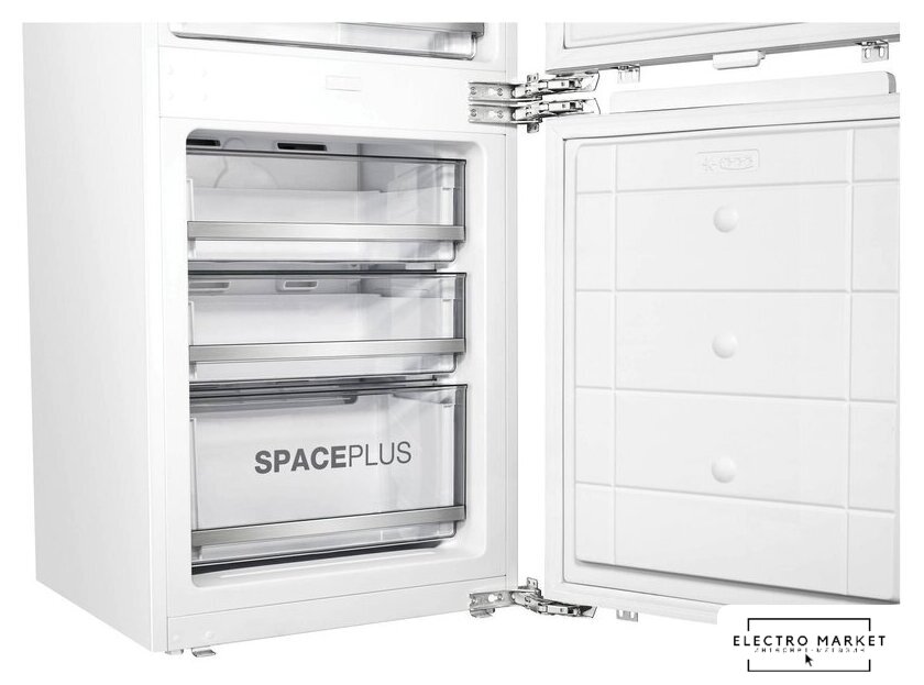 встраиваемый, плоские шарниры, без No Frost, электронное управление, класс A++, полезный объём: 270 л (209 + 61 л), инверторный компрессор, перенавешиваемые двери, лоток для яиц, 55.8x54.5x177.2 см, белый