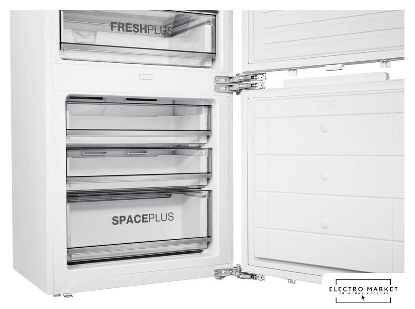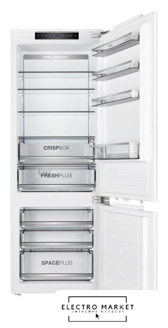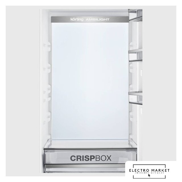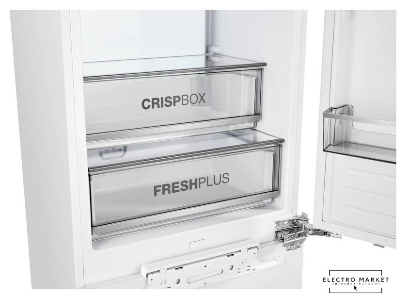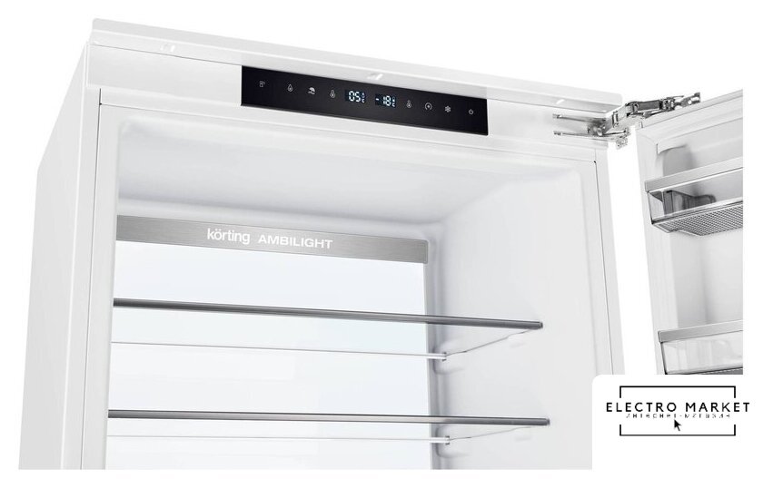 встраиваемый, полный No Frost, электронное управление, класс A++, полезный объём: 284 л (215 + 69 л), инверторный компрессор, зона свежести, перенавешиваемые двери, полка для вина, лоток для яиц, 54x54.5x193.5 см, белый