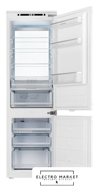 встраиваемый, скользящие направляющие, No Frost (морозильная камера), электронное управление, класс A+, полезный объём: 253 л (183 + 70 л), перенавешиваемые двери, лоток для яиц, 55.9x54.6x177 см, белый